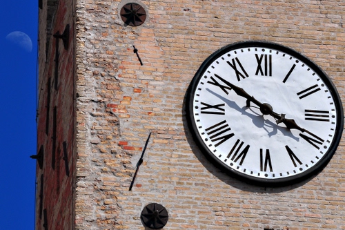 Tag: orologio, lancette, numeri, torre, quadrante, luna, mattoni, campanile.
