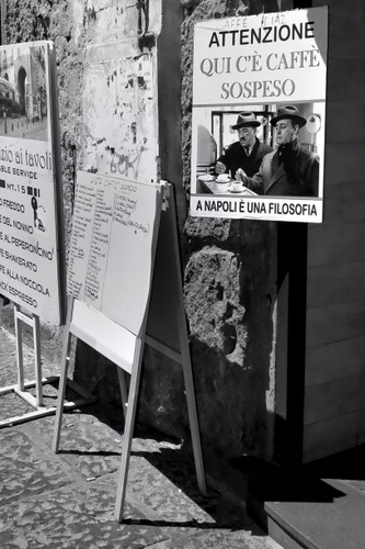 Antica tradizione popolare napoletana, quella di entrare in un bar, sorbirsi un buon caffè e pagarne un secondo da destinare generosamente a coloro che non hanno la possibilità di pagarsene uno.