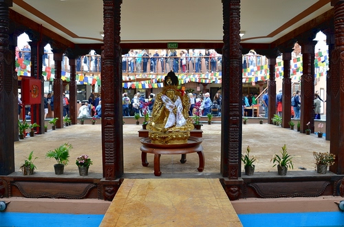 Ripresa dalle spalle del Budda. Difronte a Lui la folla dei visitatori in attesa di sfilargli davanti.