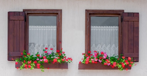 Tag: fiori, finestre, legno, gerani, tendine, tende, imposte, due, ante, vasi, bianco, muro, rosso, vetro, colori, vetri.