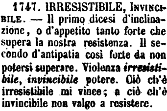 | Irresistibile, Invincibile - Il primo dicesi d'inclinazione, o d'appetito tanto forte che supera la nostra resistenza. il secondo d'antipatia così forte da non potersi superare. Violenza irresistibile, invincibile potere. Ciò ch'è irresistibile mi vince; a ciò ch'è invincibile non valgo a resistere. [immagine] |