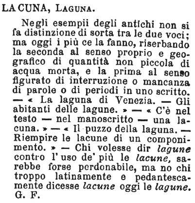 | Lacuna, Laguna - Negli esempii degli antichi non si fa distinzione di sorta tra le due voci; ma oggi i più ce la fanno, riserbando la seconda al senso proprio e geografico di quantità non piccola di acqua morta, e la prima al senso figurato di interruzione o mancanza di parole o di periodi in uno scritto. - «La laguna di Venezia. - Gli abitanti delle lagune.» - «C'è nel testo - nel manoscritto - una lacuna.» - «Il puzzo della laguna. - Riempire le lacune di un componimento.» - Chi volesse dir lagune contro l'uso de' più le lacune, sarebbe forse perdonabile, ma no chi troppo latinamente e pedantescamente dicesse lacune oggi le lagune. G. F. [immagine] |