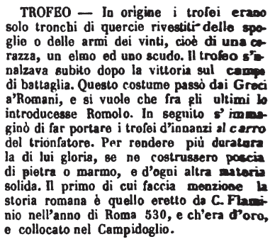 | Trofeo - Innalzare un Trofeo, a sentimento degli Antichi, era l'appendere ad un tronco d'albero le armi, di cui il Vincitore aveva spogliato il suo nemico dopo di averlo ucciso. |